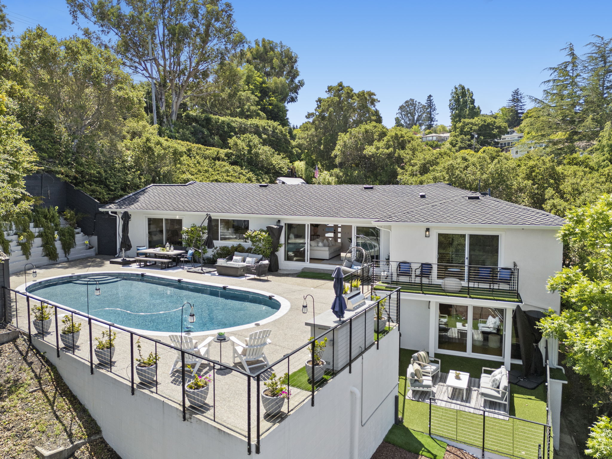 Welcome to 2620 Summit Drive in Burlingame Hills is a stunning 4‑bedroom, 4‑bath residence offering 3,269 sq ft of thoughtfully designed living space with a seamless blend of modern updates and timeless character. Set on a generous lot, the home welcomes you with soaring vaulted ceilings, expansive windows, and an open floor plan that fills each room with natural light and frames sweeping views of the Bay and SFO. The chef’s kitchen, complete with quartz counters, a waterfall island, and premium European appliances, flows into the living and dining areas, creating an ideal setting for both everyday comfort and entertaining. The primary suite offers a private balcony, walk‑in closet, and spa‑inspired bath, while the lower level features a guest suite, oversized family room, and direct access to the landscaped backyard. Outdoor living shines with a heated pool, multiple terraces, and serene spaces for relaxation or gatherings.